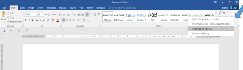 2. בקצה סרגל הבית (בחלקו הריק) נלחץ קליק ימני, ונבחר את האפשרות השלישית: Customize the Ribbon.