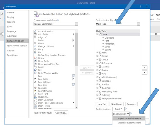 3. בחלון שייפתח נוודא שהסרגל הראשי מסומן (customize the Ribbon>Main Tabs).